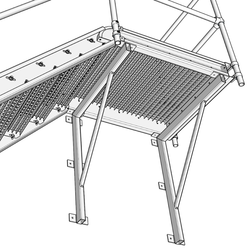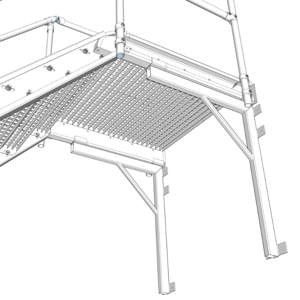 Les paliers en caillebotis maille 33×33 sont vendus avec 2 profils en forme de tube de 80x80x3 mm, 2 profils en L perforés (3 pour les paliers à sortie latérale) , ainsi que 4 fixations pour brider le caillebotis au support.